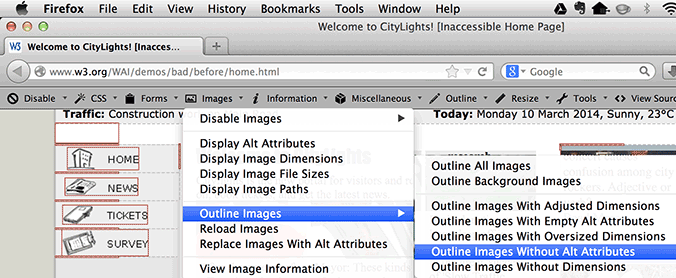 First use the Accessible Home Page www.w3.org/WAI/demos/bad/after/home with one of the checks above to turn off images, disable CSS, and linearize.