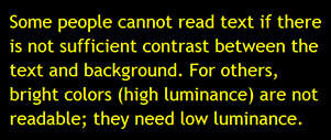 This page covers just a few accessibility issues. There are other accessibility issues not covered in these easy checks, for example: links, data table markup, reliance on color, and much more.