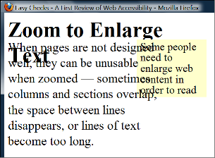 Web pages are often designed with multiple columns, sections, colors, and other visual aspects that help organize information for people who see the page in its default display. However, some people do not see the page this way. People who are blind listen to the page with a screen reader or read it from a Braille display. Some people with low vision and others change the way the page is displayed so they can read it; for example, change from multiple columns to one column, change the text size, and more.